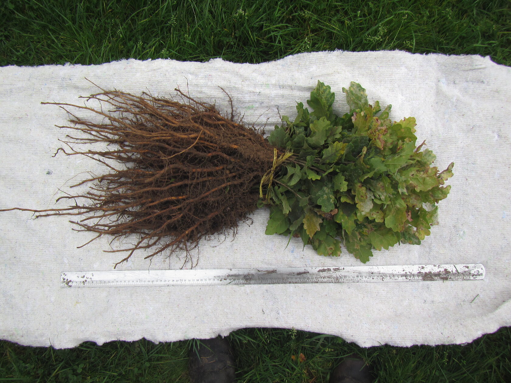 В будущем мы планируем хотя бы часть дубов при восстановлении широколиственного леса высаживать саженцами - то есть посадочным материалом, выращенным в питомнике с промежуточной пересадкой. Главный плюс саженцев в том, что за счет подрезки главного (стержневого) корня при этой самой промежуточной пересадке у них формируется более компактная корневая система, которая меньше травмируется при выкопке и посадке уже на постоянное место. При подготовке почвы вручную, лопатами, в условиях сложного рельефа, высокой и густой травы - это важно, поскольку позволяет с меньшими затратами физического труда сажать более крупные дубы, которым уже не так страшна конкуренция со всяким бурьяном. По нашему прошлому опыту, оптимальный вариант выращивания саженцев такой: один год в посевном отделении питомника, с наиболее интенсивным уходом - затем пересадка в школку с подрезкой стержневого корня на глубине 12-15 см, и доращивание в течение еще одного-двух лет. Сколько именно доращивать - зависит прежде всего от того, на участках с какой травой предполагается сажать дубы (нам больше приходится иметь дело с высокой травой, особенно там, где земля интенсивно зарастает инвазивными видами - люпином многолистным и золотарником канадским).