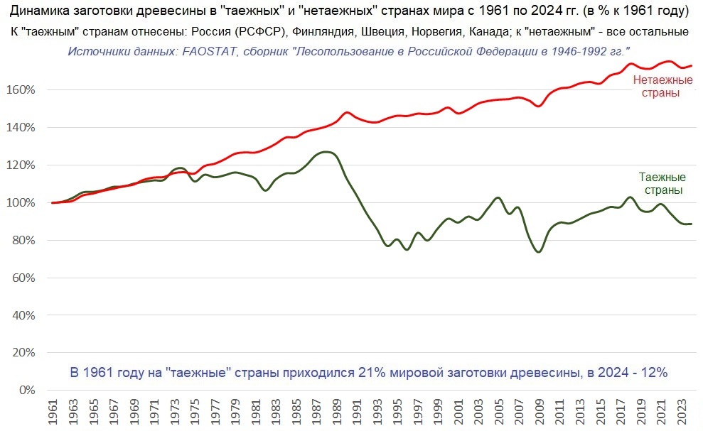 Даже там, где никакого лесного хозяйства нет, или есть какая-то имитация хозяйства, но леса все равно возобновляются и растут сами, спонтанно - лесопользование на староосвоенных землях сильно зависит от их продуктивности, то есть в первую очередь тоже от того, насколько климат благоприятен для роста деревьев. Просто потому, что даже в условиях полной бесхозяйственности в спонтанно выросших на вырубках, гарях или заброшенных землях лесах запасы ценной древесины в более теплом климате восстанавливаются быстрее, чем в более холодном.