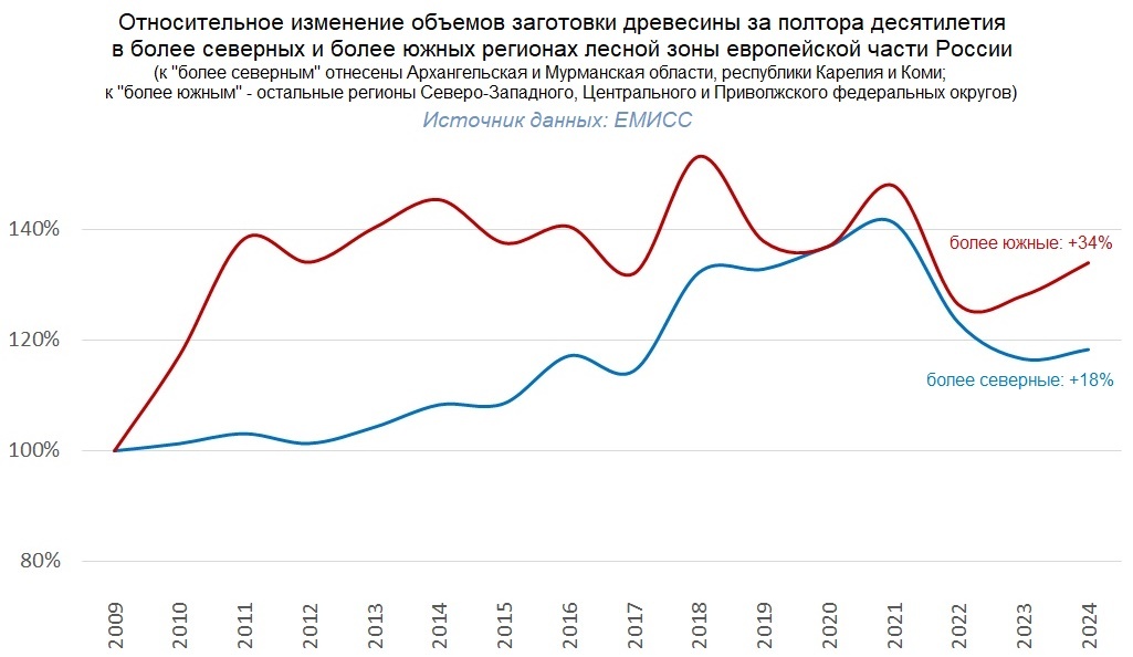 У нас пока господствует экстенсивная модель лесопользования, поэтому основные факторы, которые способствуют смещению лесного комплекса к югу, работают относительно слабо. Но, тем не менее, и у нас роль наиболее северных регионов в общей заготовке древесины постепенно сокращается. Очевидно, что с течением времени эта тенденция будет нарастать и усиливаться.