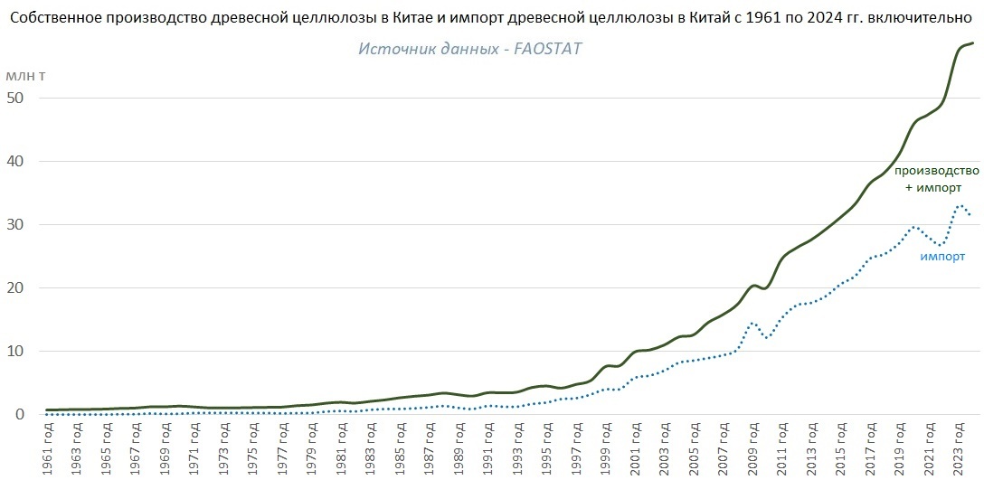 Совокупные объемы собственного производства древесной целлюлозы в Китае и ее импорта в Китай продолжают устойчиво расти на протяжении уже нескольких десятилетий, хотя в 2024 году этот рост несколько замедлился, а импорт даже заметно сократился по сравнению с предыдущим годом. Тем не менее, сумма производства и импорта древесной целлюлозы в 2024 году составила в Китае 58,7 млн т (на 34% больше, чем в среднем за десятилетие с 2015 по 2024 гг.), в том числе импорт - 31,0 млн т (на 16% больше).