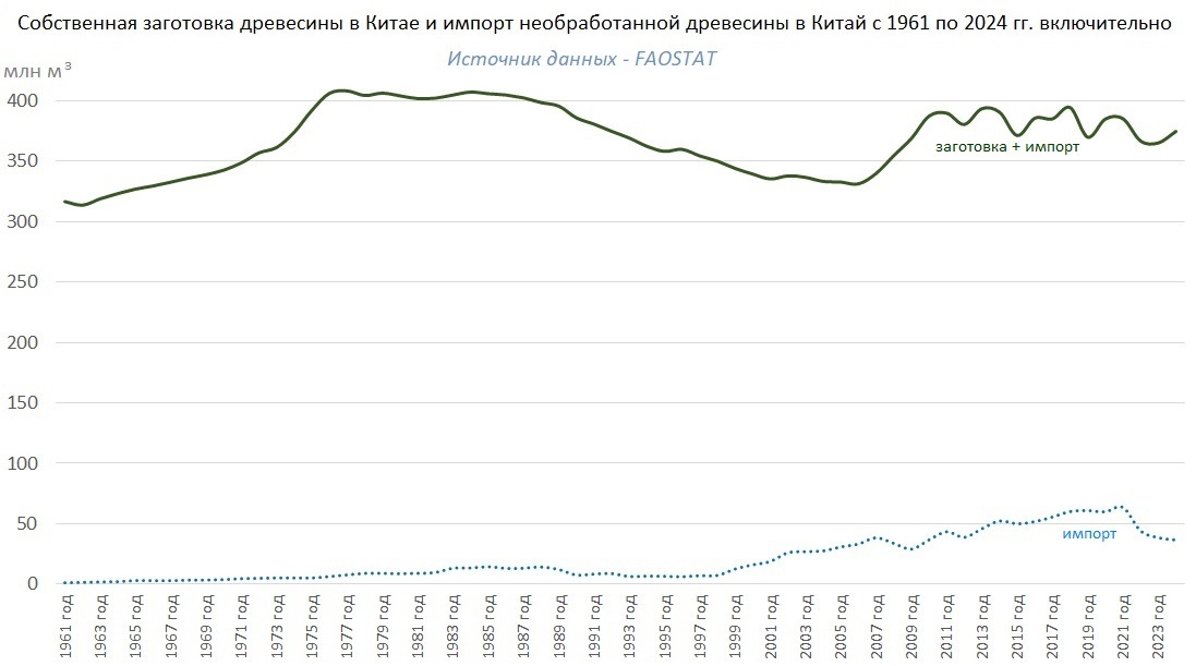 Данные FAOSTAT показывают относительную устойчивость объемов получения древесины (собственной заготовки и импорта в необработанном виде) в Китае на протяжении последних десяти-пятнадцати лет. В среднем за последнее десятилетие (2015-2024, за 2025 год данных пока нет) этот объем составил 378,2 млн м3 в год (в т.ч. собственная заготовка - 326,1 млн м3в год). В 2024 году общее получение древесины в Китае составило 374,6 млн м3 (на 1% ниже среднего за десятилетие), а импорт - 36,4 млн м3 (на 30% ниже).