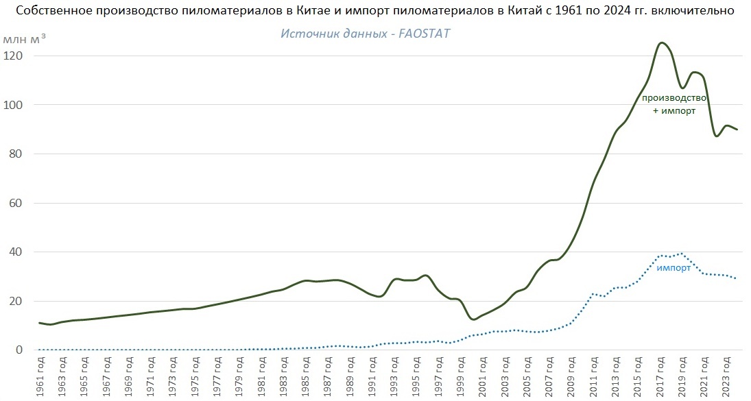 К сожалению, публикуемая Китаем статистика как по лесной торговле, так и по заготовке древесины и производству основных видов лесной продукции, не очень детальна. Тем не менее, о долгосрочных тенденциях вполне можно судить по данным системы FAOSTAT (основного глобального источника статистических данных, связанных с сельским и лесным хозяйством, поддерживаемого Продовольственной и сельскохозяйственной организацией ООН).