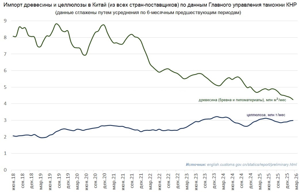 Предварительные и пока неофициальные оценки заготовки и импорта древесины и основных продуктов ее переработки в Китае в 2025 году показывают, что тенденции последних лет, о которых идет речь выше, пока сохраняются. То есть Китай в целом все лучше обеспечивает себя собственным древесным сырьем, в основном выращиваемым на лесных плантациях или в районах с интенсивным лесным хозяйством, и все меньше зависит от ипорта древесного сырья или продукции деревообработки - соответственно, он будет эти виды продукции покупать в меньших, чем ранее, объемах и (или) на худших, чем ранее, условиях для основных зарубежных поставщиков. От импорта целлюлозы Китай пока по-прежнему сильно зависит, но и эта зависимость с течением времени постепенно сокращается.