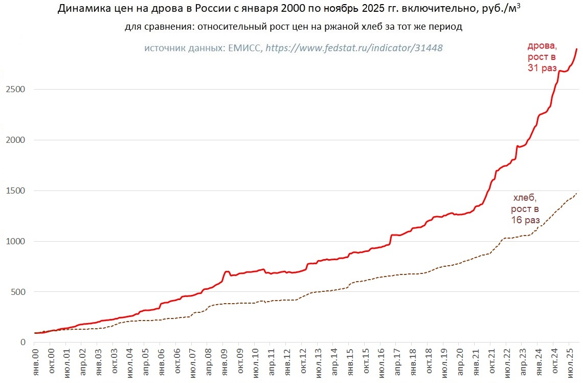 Но при всем этом дрова, как минимум в целом по стране - один из самых быстро дорожающих социально значимых ресурсов. Конечно, ситуация очень разная в разных регионах. Например, там, где вдруг обнаруживается большой и почти дармовый источник дровяной древесины (от массовых санрубок, или от расчистки крупных участков под застройку, или от раскорчевки возвращаемых в сельскохозяйственный оборот угодий и т.д.) - цена дров может резко снижаться. Разумеется, сезонность тоже влияет на цену дров - осенью и зимой они обычно дороже, чем весной и летом. Но в целом она растет, как в абсолютном исчислении, так и по отношению к большинству других социально значимых товаров и ресурсов.