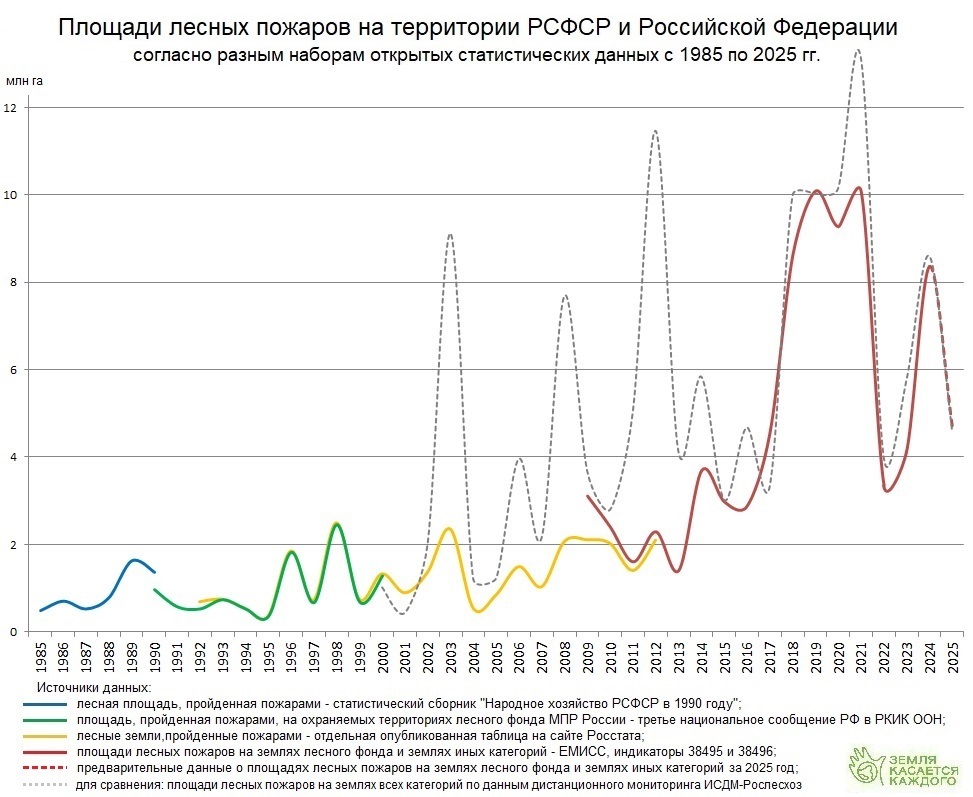 Надежных долгосрочных рядов единообразных статистических данных о площадях лесных пожаров в РСФСР и Российской Федерации нет. Ежегодные данные до 1985 года вообще не публиковались в открытых источниках, а после подходы к учету лесных пожаров неоднократно менялись. Формально полностью сравнимые ряды статистических данных по лесным пожарам на землях лесного фонда и землях иных категорий есть с 2009 года по настоящее время, но реально сравнимыми эти данные стали лишь примерно с 2014 года (когда были воплощены в жизнь довольно серьезные меры по борьбе с лесопожарной ложью). Сравнимые данные дистанционного мониторинга системы ИСДМ-Рослесхоз есть с начала XXI века - их сравнимость тоже не абсолютна, поскольку с течением времени растет и количество специализированных спутниковых систем, и качество обработки дистанционных данных. Тем не менее, дистанционные данные ИСДМ за период с 2000 года по настоящее время - это пока лучший и практически единственный ряд данных, позволяющий судить о долгосрочной динамике площадей пожаров. Следующий глобальный технологический прорыв в учете лесных пожаров ожидается в 2027-2028 годах с планируемым введением в действие специализированной системы спутникового мониторинга FireSat.