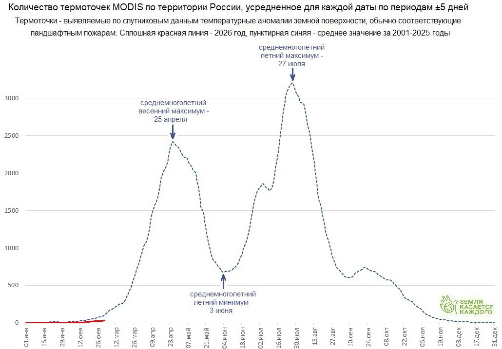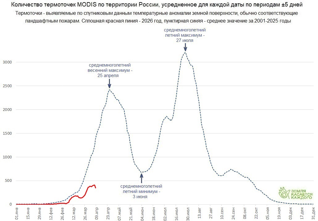 Термоточки - выявляемые специализированными спутниками тепловые аномалии поверхности Земли, чаще всего вызванные ландшафтными пожарами. Относительно небольшая часть термоточек может быть связана с техническими объектами (факелами сжигания попутного нефтяного газа, крупными промышленными предприятиями и т.д.), пожарами в населенных пунктах, или извержениями вулканов - для общего анализа динамики пожаров их доля несущественна. Для сравнения нынешней ситуации со среднемноголетней наиболее подходят термоточки, полученные сенсорами MODIS, установленными на спутниках Terra и Aqua - эти данные охватывают период примерно в четверть века.