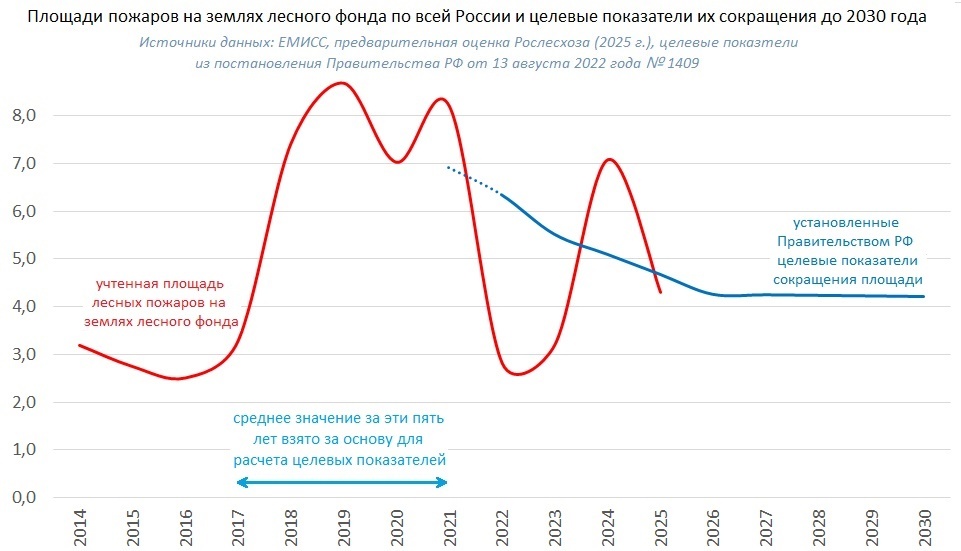 4257,5 тыс. га - целевой показатель сокращения площади лесных пожаров на землях лесного фонда в целом по России на 2026 год (утвержден постановлением Правительства РФ от 13.08.22 № 1409) - площадь, которая не должна быть превышена по итогам года