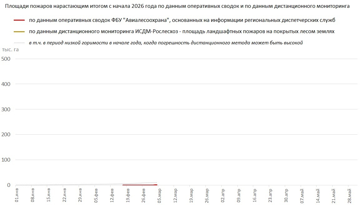 25 февраля - первый в России в 2026 году официально зарегистрированный крупный лесной пожар - в Хасанском районе Приморского края. Причина - переход на лес пала сухой травы с сопредельных земель. По предварительным данным, общая площадь ландшафтного пожара составила 5,2 тыс. га, в т.ч. на землях лесного фонда - 720 га.