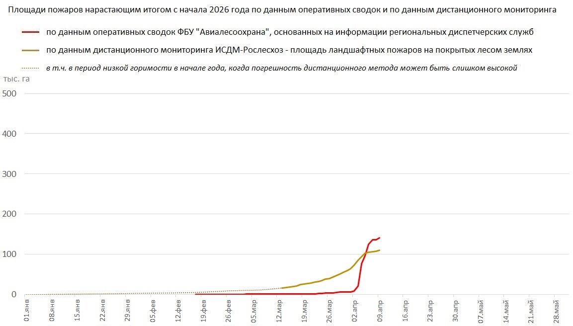 141,5 тыс. га - площадь лесных пожаров с начала года по оперативным сводкам Авиалесоохраны