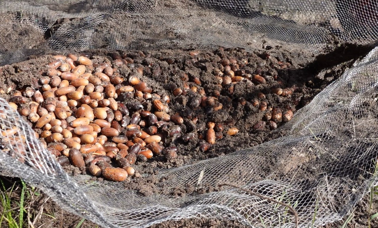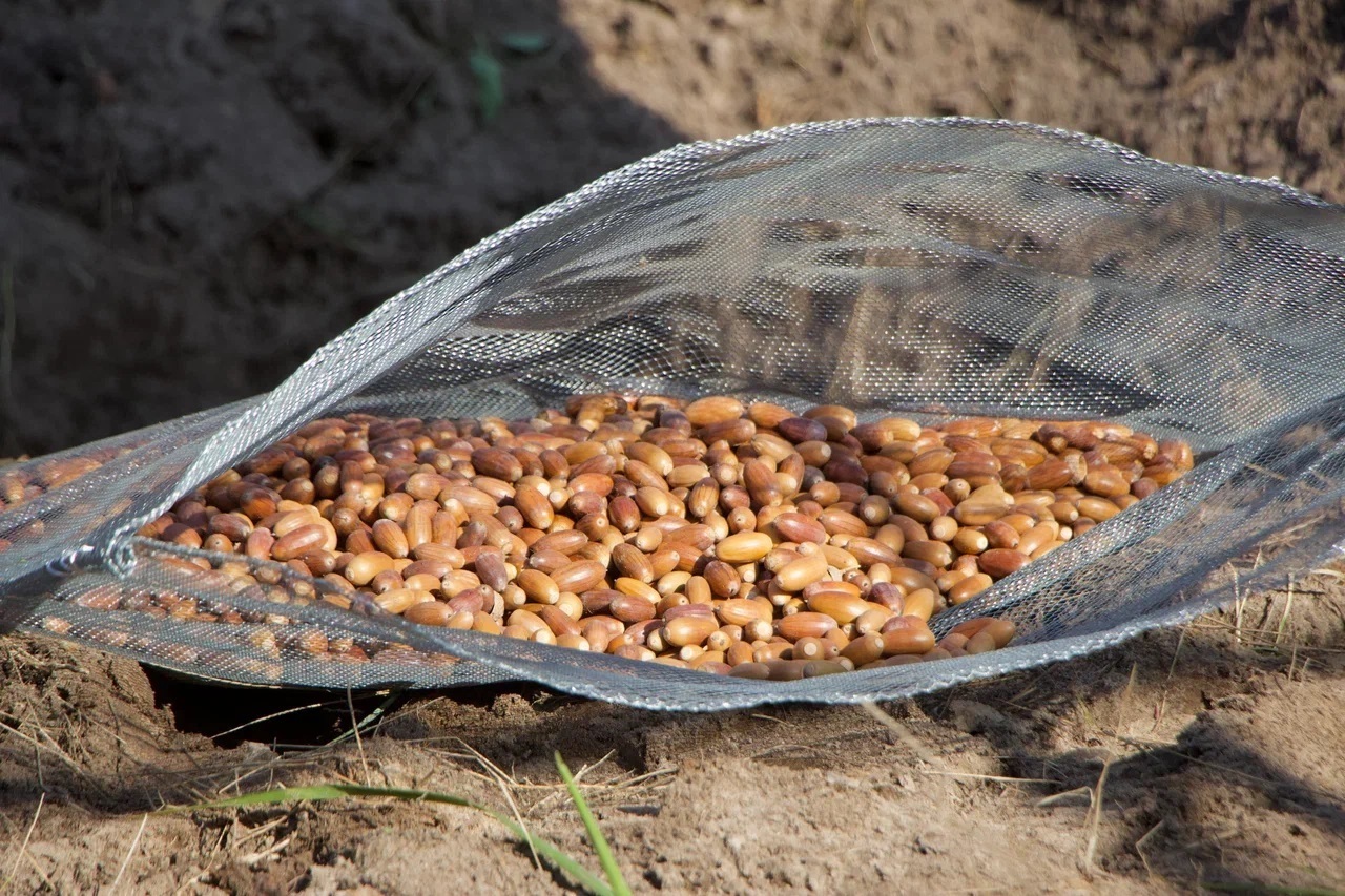 Желуди можно посеять в питомнике сразу после сбора, осенью, а можно - сохранить в подходящих условиях до весны, и посеять весной. Если сеять осенью - есть очень большой риск, что значительную часть посеянных желудей съедят мыши (этот риск можно немного снизить, посеяв непосредственно перед морозами - но его нельзя избежать совсем). Если сеять весной - желуди надо сохранить в подходящих условиях (при температуре около нуля градусов или чуть выше, высокой влажности, чтобы не высохли, и достаточном доступе воздуха, чтобы не задохнулись). Варианты могут быть разные: хранение в мешках или лотках в холодном погребе, в сетках в проточных водоемах подо льдом, в мышенепроницаемых металлических сетках или ящиках, зарытых в землю, и т.д. Мы перепробовали в разные годы почти все, и в конце концов сочли оптимальным для наших условий (легкой песчаной и хорошо дренированной почвы) закапывание в металлических мелкоячеистых сетках на глубину в 10-15 см (от верха сетки). Сейчас у нас зарыты и ждут весны 2026 года две таких сетки с желудями, по четыре ведра в каждой.