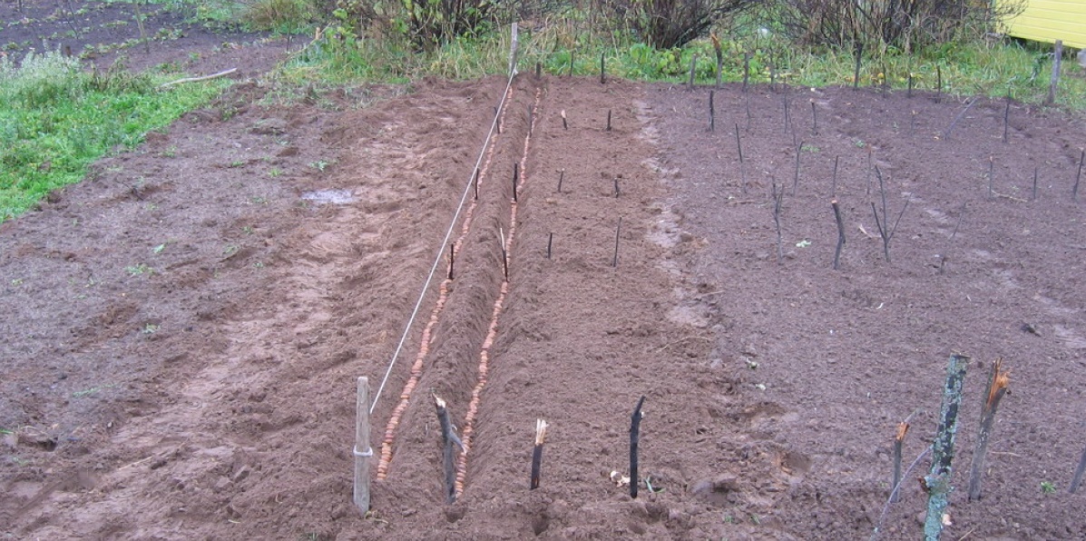После разметки рядков надо сделать бороздки глубиной 4-5 см - лучше всего небольшой тяпкой или иным подобным инструментом, позволяющим делать борозды V-образной формы. Чем прямее будут эти бороздки, тем ровнее будут ряды желудей и сеянцев, и тем легче их будет в дальнейшем полоть и рыхлить. Геометрически правильный посев важен не для красоты и видимой аккуратности, а именно для простоты последующей обработки и минимизации трудозатрат в конце весны и в течение всего лета.
