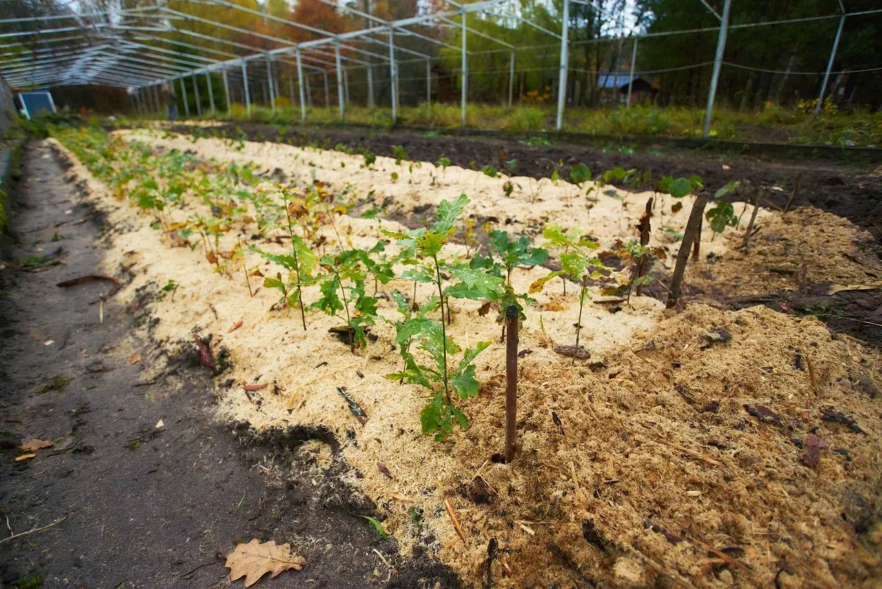 После посева грядки с желудями желательно замульчировать - покрыть сплошным слоем опилок или чего-нибудь подобного, чтобы уменьшить испарение воды и замедлить отрастание сорняков. На этом этапе для мульчирования лучше не использовать сено или солому - это будет мешать рыхлению почвы и выпалыванию сорняков на ранних этапах развития всходов дуба (сено, солому или свежую траву можно будет использовать для мульчирования позднее, уже летом).