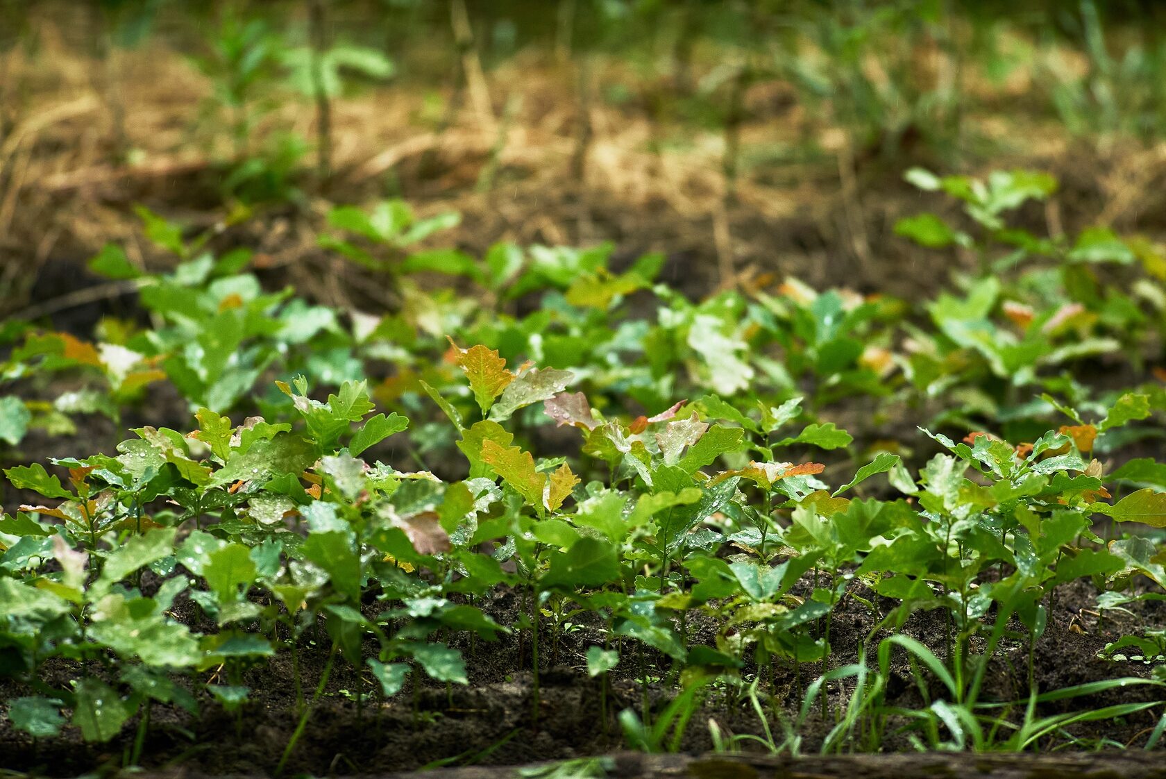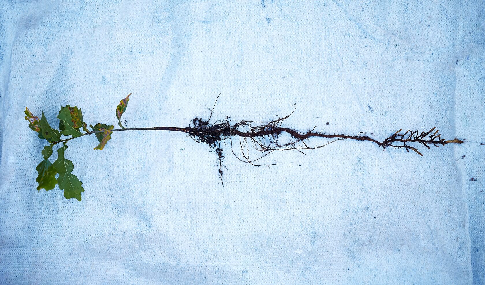 2. Посадка сеянцами (молодыми деревьями, как правило, однолетними или двухлетними, выращенными в питомнике непосредственно из желудей, без промежуточной пересадки). Главные плюсы: все еще относительная простота и дешевизна, но уже меньшая конкуренция с окружающей растительностью. Главные минусы: неизбежное обрезание части стержневого корня, и все еще слишком маленький размер, чтобы полностью избежать затенения бурьяном.