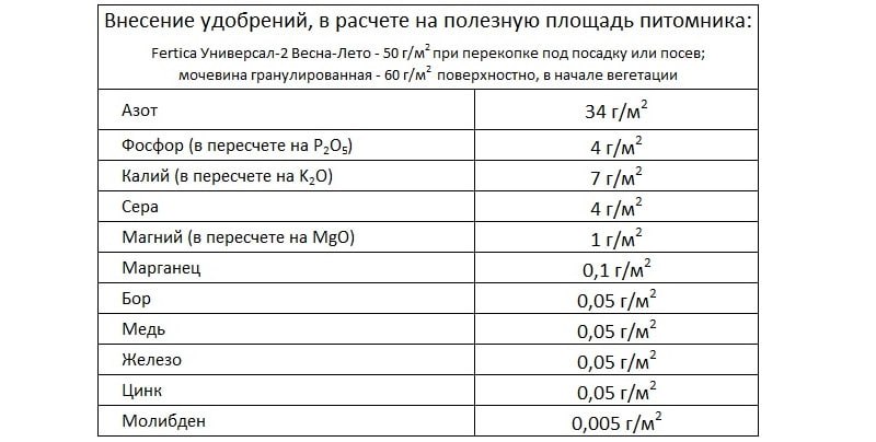 Сколько и каких удобрений нужно внести перед посевом желудей - очень сильно зависит от почвы и от того, что и как на ней выращивалось раньше. По этому поводу есть неплохой документ - Наставление по системам применения удобрений в лесном хозяйстве на европейской территории СССР 1991 года (он несколько сложноват для практического применения, но в первом приближении на него вполне можно ориентироваться). Как правило, особенно на легких песчаных и супесчаных почвах в условиях Нечерноземья, выращивание качественных сеянцев дуба за один сезон требует двойного внесения удобрений - комплексного минерального удобрения, лучше всего с основными микроэлементами, под перекопку почвы весной, и дополнительной подкормки азотными удобрениями в начале лета (или даже двух таких подкормок). Оптимальные нормы внесения удобрений в условиях конкретного питомника обычно подбираются опытным путем. В нашем случае в сезоне 2025 года мы использовали примерно такие нормы (в пересчете на действующие вещества), одинаковые для посевов и школок дуба - они примерно соответствуют вышеуказанному Наставлению: