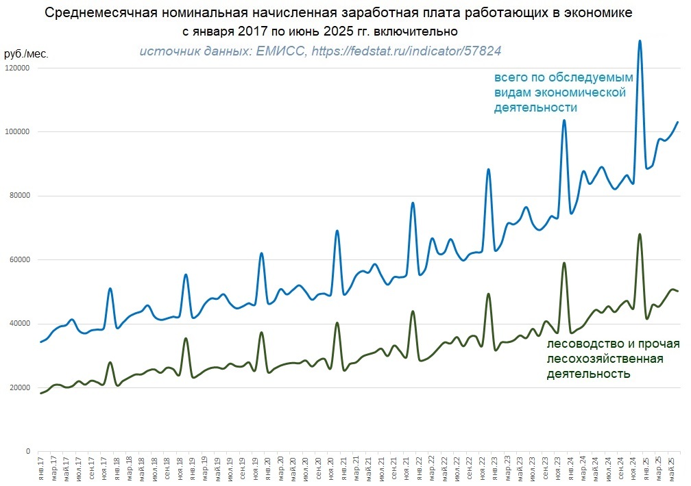 Российское лесное хозяйство на фоне других отраслей российской экономики выглядит, мягко говоря, очень бедным, если не нищим. По данным официальной статистики (ЕМИСС, показатель "среднемесячная номинальная начисленная заработная плата работающих в экономике"), зарплата тех, кто занят лесоводством и прочей лесохозяйственной деятельностью, примерно вдвое ниже средней зарплаты по всем обследуемым Росстатом видам экономической деятельности. Такая ситуация устойчиво сохраняется на протяжении очень многих лет - в ЕМИСС есть сопоставимые данные с 2017 года, но принципиально она не менялась с конца нулевых.