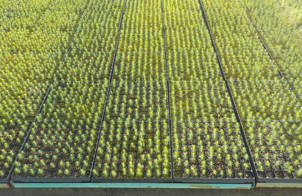 2. Выращивание сеянцев с закрытой корневой системой (ЗКС) - обычно в специальных кассетах, где каждый сеянец растет в своей индивидуальной ячейке в специально подготовленном плодородном грунте, или, иногда, вообще в отдельных горшках. Как правило, сеянцы с ЗКС выращивают в специальных пленочных теплицах, и лишь в конце выставляют на открытые площадки для закаливания (и, если надо, зимовки). Когда такие сеянцы вынимают из ячеек или горшков - на их корнях остается сформировавшийся и скрепленный этими корнями ком земли, позволяющий корням не пересыхать и непрерывно обеспечивать сеянец необходимой влагой и питательными веществами. Опыты по выращиванию и использованию таких сеянцев проводились в России с середины прошлого века, но достаточно массовой эта технология стала только в нулевые годы нынешнего века. Сейчас на нее приходится примерно 20% проектной производительности действующих в России лесных питомников. Такие сеянцы обычно в несколько раз дороже, чем с ОКС, но у них есть несколько важных плюсов: более высокая приживаемость, растянутый по времени период, когда их можно сажать, более экономное расходование семян (что важно, когда семена высококачественные и дорогие), и, как правило, более короткий период адаптации сеянца к новым условиям после высадки. Благодаря более высокой и предсказуемой приживаемости, для таких сеянцев действующими правилами установлена более низкая минимальная густота посадки - в 2 тыс. шт./га, а для дуба даже в 1 тыс. шт./га. Есть и минусы: при использовании наиболее распространенных в российской практике вариантов кассет (с объемом ячейки 75-100 мл) корневая система получается довольно компактной и неглубокой, что может вести к пониженной приживаемости в сухих условиях. Кроме того, у деревьев с мощными стержневыми корнями, например - дуба, часть этих корней может скручиваться внизу ячейки, что потом в течение многих лет отражается на жизни дерева (есть способы этого избежать, но об этом необходимо специально позаботиться). Сроки выращивания сеянцев с ЗКС обычно составляют, в зависимости от породы и конкретной технологии выращивания, один-два года.